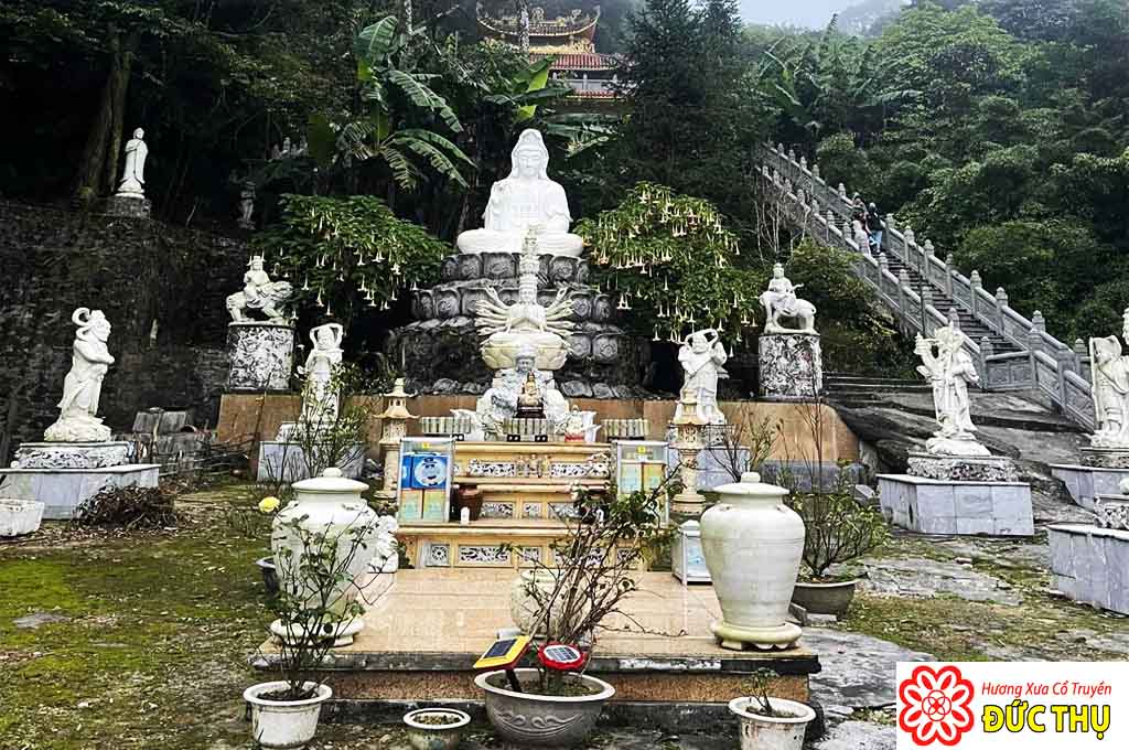 Bà Chúa Thượng Ngàn - Đền Thờ Bà Chúa Thượng Ngàn - Tam Đảo Lối đi là những bậc thang lót đá xanh có tay vịn ở hai bên đan xen khéo léo bằng bê tông cốt thép. Tuy nhiên sự chắc chắn mà cũ kĩ của con đường đi khiến vẻ hiện đại dường như không có chỗ để xen vào. Cảm nhận trong suốt quãng đường di chuyển là sự cổ kính, tĩnh lặng, thư thái và linh thiêng.