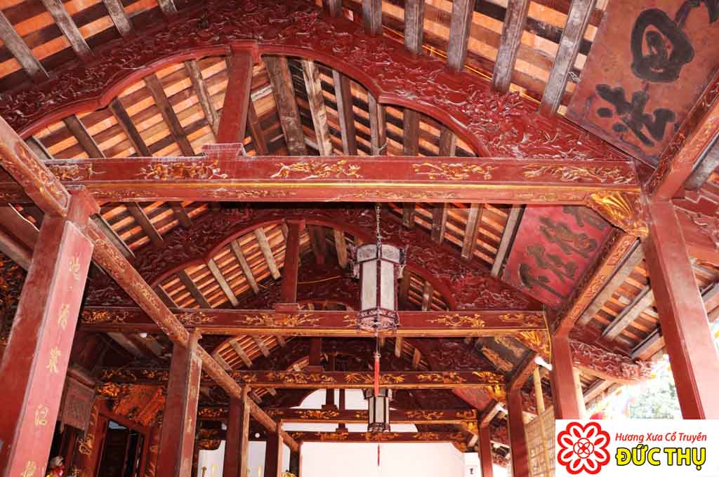 Ngôi nhà rộng 5 gian với khung gỗ lim. Trên nóc nhà của bái đường là hệ thống đắp nối theo đề tài tứ long chầu nguyệt. Cả 4 con rồng đều có kiểu dáng thân hình uốn lượn, mắt, râu, vuốt, đều được các nghệ nhân xưa thể hiện như đang vờn nhau bay lượn nhưng vẫn giữ được sự oai phong.