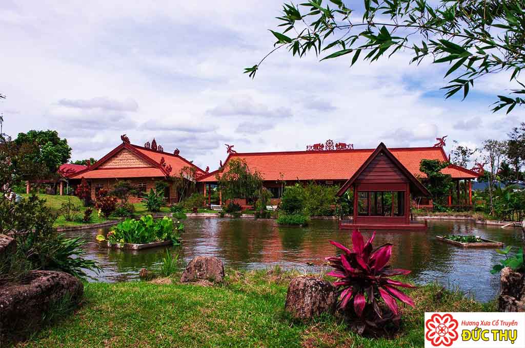 Phóng tầm mắt xa xa là điện thờ gam màu đỏ nổi bật được đặt chính giữa hồ sen. Bên cạnh những công trình bề thế, khuôn viên ngôi chùa còn dẫn lối du khách bằng những thảm cỏ mượt như nhung, xen kẽ là các pho tượng A Di Đà, tượng Thích Ca Mâu Ni, tượng Phật Quan Thế Âm…